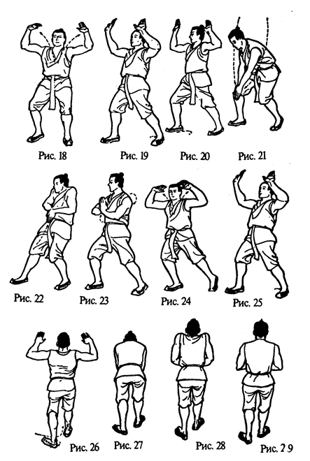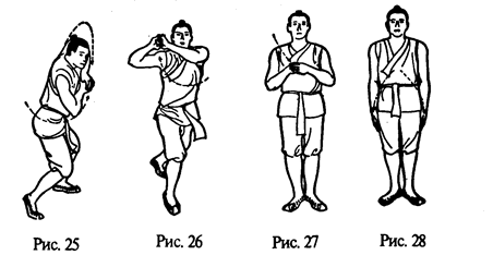 Правая рука идет вправо-вверх, описывая дугу, и выпрямляется, а левая — влево-вниз, также описывая дугу, и выпрямляется. Ладони рук впитывают земную „инь" (рис. 24). Затем правая рука возвращается по центральной линии в исходное положение, а левая рука снизу-вверх, описывая дугу через высшую точку над головой, возвращается в положение перед грудью. Здесь она соединяется с правой в традиционном китайском рукопожатии (рис. 25). Сомкнутые кисти рук поднимаются до уровня перед правой щекой. Одновременно правая йога сгибается. Ее