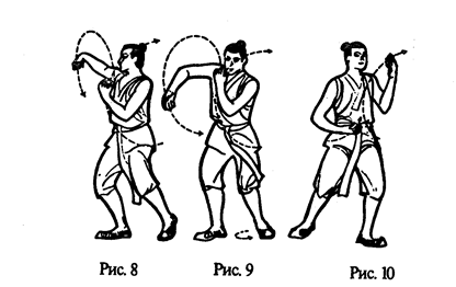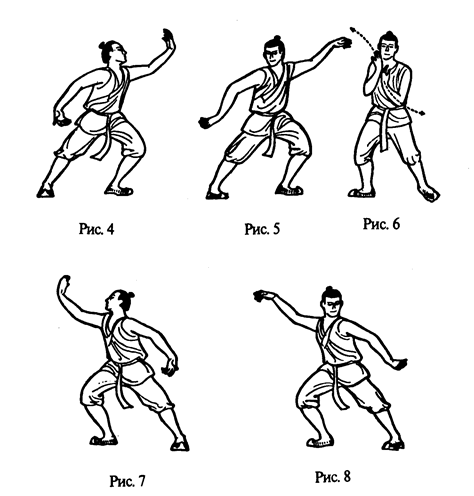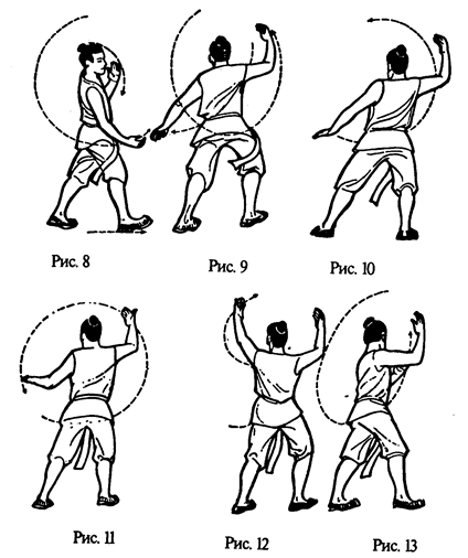 2. Руки поднять перед собой. Они как бы держат мяч — правая сверху, левая снизу, ладони друг против друга (рис. 2). Руки разводятся в стороны: левая — влево-вверх и выпрямляется, ее ладонь при этом поворачивается от себя и затем к себе; правая - влево-вниз и выпрямляется, ее ладонь при этом поворачивается вначале от себя, затем к себе. Одновременно левая нога делает полшага влево, на нее переносится тяжесть тела. Голова поворачивается, смотреть на правую руку. Так образуется поза феникса с распростертыми крыльями (рис. 3—5). Руки возвращаются в положение у груди, как указано на рис. 6. Правая рука поднимается вправо-вверх, вначале ладонью от себя, затем к себе, и выпрямляется, а левая рука - влево-вниз, вначале ладонью от себя, затем к себе, и выпрямляется. Одновременно туловище поворачивается вправо, тяжесть тела перемещается на правую ногу. Смотреть на левую руку. Вновь образуется поза феникса с распростертыми крыльями (рис. 7-8). Упражнение повторить 4 раза, включая движения и вправо и влево.