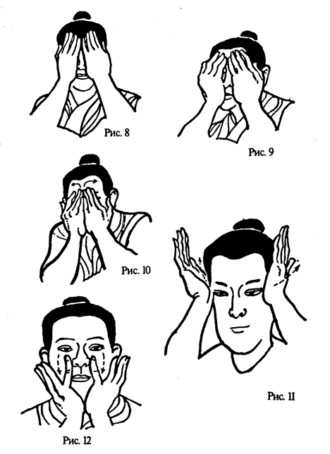 2. Горячие после трения от предыдущего варианта и смыкания ладони осторожно прижимать к глазам 8 раз. Даосы называют эти движения „Прижимание глаз". Затем ладони выгнуть (руки остаются на месте — у глаз), образуя полусферы (рис. 9). Глаза открыть, вращать ими слева направо и справа налево по 8 раз в каждую сторону. Это по-даосски „Вращение глаз". В заключение под ладонями открывать и смыкать веки (8 раз). Это по-даосски „Смыкание глаз". Все три движения имеют общее название „Три поглаживания глаз".