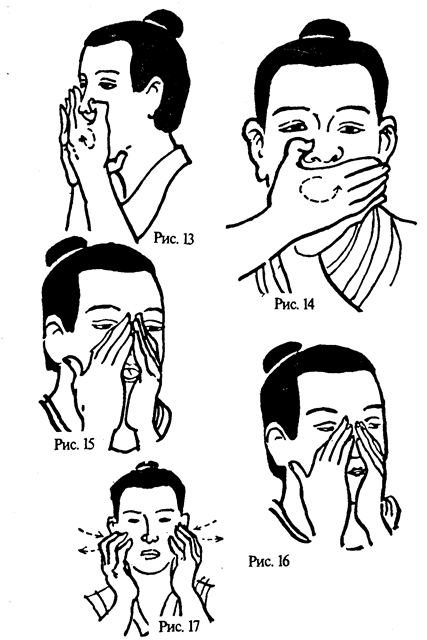 2. Произвести поглаживание той частью ладони, которая примыкает к большому пальцу, от углов глаз к вискам (8 раз). Даосы называют этот вариант „Поглаживанием хвоста феникса".