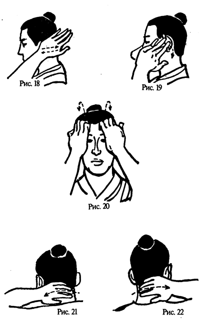 2. Горячими ладонями потереть уши 8 раз — вперед-назад (рис. 18). Обратить внимание на то, что при движении назад следует прикладывать больше силы. Затем средним пальцем свернуть ушные раковины и при-жать их к голове, указательные пальцы наложить на средние и трижды помассировать уши движением вниз (рис. 19).