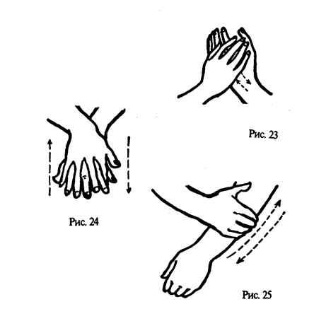 2. Потереть ладони одна о другую. Затем теплой ладонью одной руки произвести поглаживание кисти другой руки (не забывая про межпальцевые поверхности), предплечья, как при мытье (рис. 23—25).