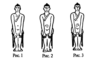 см), вращалась вокруг пупка слева направо, рисуя круг диаметром цунь (3 см) (рис. 2). Так 8 раз непрерывно. После этого сделать три глубоких вдоха и выдоха животом (вначале вдох, потом выдох; при вдохе живот выпячивается, при выдохе подбирается). Повторить упражнение еще 8 раз, совершая вращение точки ниже пупка уже справа налево. Посторить дыхательную часть упражнения (рис.3).