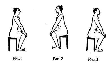 Сесть ровно, прямо, расправить грудь, выпрямить спину. Ноги поставить вместе (ступня к ступне), пятки чуть оторваны от земли. Руки ладонями вниз положить на колени (рис. 1).
