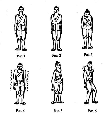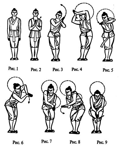 ступня образует со ступней левой ноги угол. Тяжесть тела перемещается на правую ногу. Принимается поза приветствия (рис. 26). Заканчивается часть этого упражнения позой приветствия вправо-вперед.