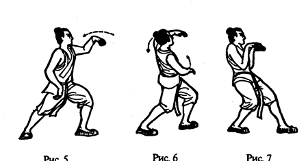 Затем начинайте поочередное вращение плечами: вначале поднять левое плечо вперед-вверх, затем опустить назад-вниз, описывая таким образом круг. Одновременно правое плечо делает круг назад-вниз и вперед-вверх, Выполняется 16 вращении (рис. 5-6). При круговом движении плеч надо задействовать и тело, и предплечье, чтобы верхняя часть тела непрерывно двигалась, тем самым заставляя «нечистый» воздух выйти из