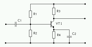 Эта схема представляет собой усилитель мощности на биполярном транзисторе, включенном по схеме с ОЭ. Переходной конденсатор C1 пропускает во входную цепь переменную составляющую напряжения источника сигнала и не пропускает постоянную составляющую. Блокирующий конденсатор C2 шунтирует резистор R4 по переменному току, исключая тем самым отрицательную обратную связь по переменным составляющим. Отсутствие конденсатора C2 привело бы к уменьшению усиления каскада. В области низших частот на работу усилителя оказывают влияние переходной и блокирующий конденсаторы, в области высших частот – частотная зависимость коэффициента тока базы, коллекторная емкость и емкость нагрузки.