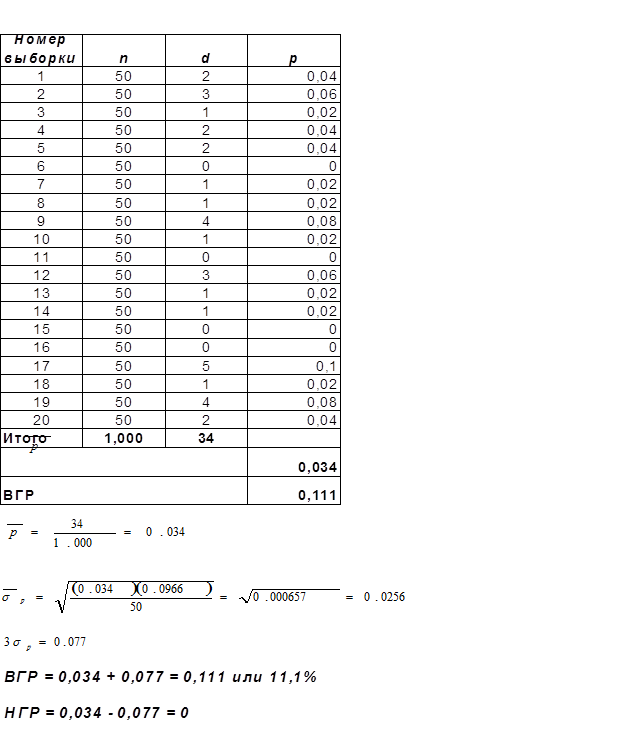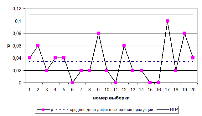 Данные приведенные в таблице, показывают результат 20 выборок (50 образцов каждая) из сосуда, в котором имеется 4% красных шариков (дефектных единиц продукции). Эти выборки имитируют ежедневную выборку из процесса, продолжающегося в течение месяца. Значения р