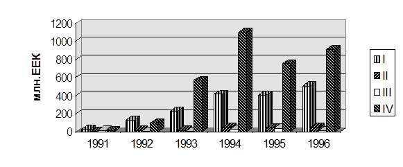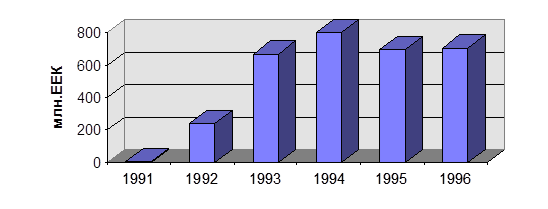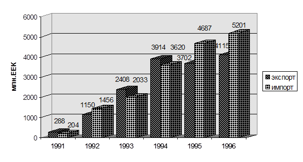 В 1993 году экспорт составил 2408,5 млн. ЕЕК, импорт 2033,3 млн. ЕЕК, сальдо было положительным и равнялось 375,2 млн. ЕЕК (6) (График 3).