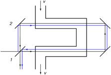 Жидкость течет в изогнутой трубке со скоростью v. Луч света от источника попадает на полупрозрачное зеркало 1 и расщепляется на два луча: один луч отклоняется вправо и, попадая в трубку с жидкостью, движется против ее течения, отражается от системы зеркал и, выйдя из трубки и пройдя через полупрозрачное зеркало, попадает на экран.