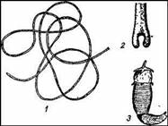 1 — взрослый червь, 2 — задний конец червя в виде развилки; 3 — личинка.