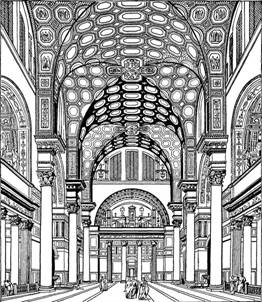 Интерьеры раннехристианских храмов отличает от памятников римского зодчества также особая легкость, почти бестелесность архитектурных форм. Этому способствуют пропорции колонн, хрупкость которых подчеркивается тем, что на них опирается чаще всего не горизонтальный антаблемент, а легкая арка. Аркада на колоннах, впервые появившаяся во дворце Диоклетиана в Сплите, находит здесь свое более последовательное применение. Прорезанные окнами и украшенные мозаиками стены среднего пефа также кажутся тонкими и невесомыми. Блеск иолированного цветного мрамора — драгоценных колонн (обычно изымавшихся из языческих храмов), облицовки степ, выложенного плптами пола в сочетании с фосфоресцирующим мерцанием мозаик — все это создавало впечатление пышности и богатства и вместе с тем способствовало дематериализации архитектурной массы. Пластическая ощутимость архитектурных форм греческой и римской архитектуры уступила здесь место своеобразному чувству одухотворенности. Преобладающие в архитектурном образе раннехристианского храма черты репрезентативности и динамического порыва призваны выражать могущество новой государственной религии и ее мистический смысл.