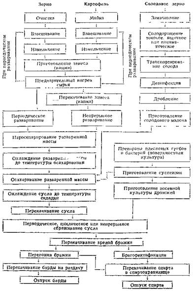 Процесс получения спирта из зерно-картофельного сырья включает следующие стадии: очистка и подготовка сырья, водно-тепловая обработка его, осахаривание разваренной массы и охлаждение сусла, приготовление засевной культуры дрожжей, сбраживание сусла, перегонка бражки и ректификация спирта.