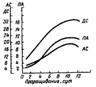 в камеру подают вентилятором кондиционированный воздух температурой 26...28 °С и относительной влажностью 96...100 %. К концу выращивания культуры температуру снижают до 24...26 °С. Общая продолжительность выращивания 36...42 ч. В тех случаях, когда использование готовой культуры для осахаривания разваренной массы задерживается более чем на 2 ч, ее высушивают до влажности 18...20 %.