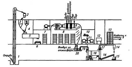 и подают в сушилку вентилятором 19.
