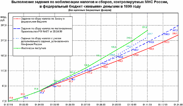 В 1999 году в консолидированный бюджет поступило 884,5 млрд. рублей налогов и сборов. Включая доходы целевых бюджетных и государственных внебюджетных фондов в размере 159,5 млрд. рублей, в бюджетную систему страны мобилизовано 1044,0 млрд. рублей налогов и сборов. «Живыми» деньгами поступило 793,4 млрд. рублей, из которых 684,8 млрд. рублей составили налоговые платежи и 108,6 млрд. рублей - доходы целевых бюджетных и внебюджетных фондов. Доходы целевых бюджетных и государственных внебюджетных фондов за 1999 год составили 159,5 млрд. рублей, в том числе «живыми» деньгами - 108,6 млрд. рублей. Из общей суммы доходов фондов более 90 % приходится на Дорожные фонды и Фонд воспроизводства минерально-сырьевой базы. Поступления «живыми» деньгами в Федеральный дорожный фонд составили 30,6 млрд. рублей. Отчисления в Фонд воспроизводства минерально-сырьевой базы за 1999 год составили 7,35 млрд. рублей. Всего в 1999 году «живыми» деньгами поступило 377,6 млрд. рублей налогов и сборов, контролируемых МНС России.