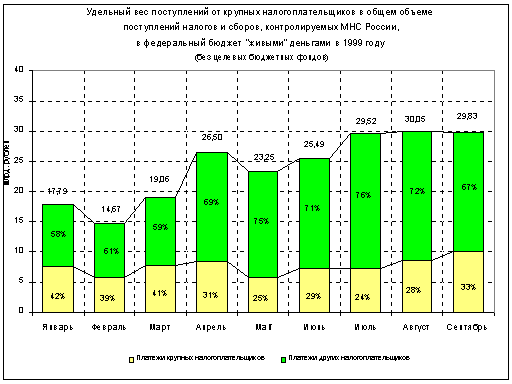 Налоговыми органами осуществляется ежедневный оперативный контроль за поступлением налоговых платежей естественных монополий (ОАО «Газпром», РАО «ЕЭС России», крупнейших нефтяных компаний и железных дорог МПС России), а также за погашением накопленной задолженности по налогам и сборам в соответствии с заключенными соглашениями и договорами. По состоянию на 1 января 2000 года в федеральный бюджет от 242 крупнейших организаций и предприятий отраслей топливно-энергетического комплекса и железнодорожного транспорта, а именно от 35 организаций, входящих в систему ОАО «Газпром», 90 организаций РАО «ЕЭС России», 99 организаций нефтяного комплекса и 18 железных дорог системы МПС России поступило «живыми» деньгами 115,2 млрд. рублей, то есть 34 % всех поступлений в федеральный бюджет. Применяемый налоговыми органами комплекс предусмотренных законодательством принудительных мер по взысканию задолженности по налогам и сборам в бюджет Российской Федерации способствовал снижению уровня недоимки, увеличению поступлений в бюджет.