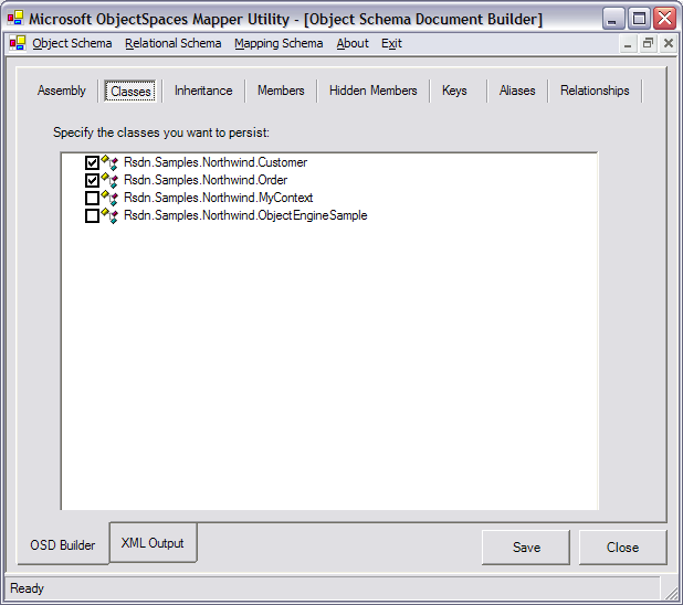 Использование нескольких XML-схем для описания структуры классов приложения, реляционной структуры БД, а кроме того еще и Mapping-схемы, не может не удручать. Конечно, в финальной версии .NET Framework 1.2 возможности визуального проектирования этих схем должны обязательно появиться, но пока их нет, можно воспользоваться сторонними средствами. Одно из таких средств входит в пример ObjectSpacesPDCSamples.zip (файл можно найти на http://www.gotdotnet.com).