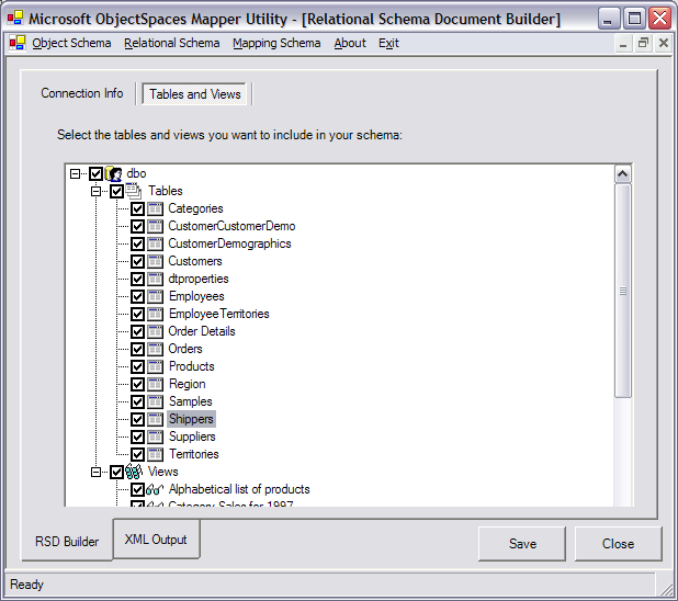 ObjectSpaces дает возможность самостоятельно формировать состояние класса MappingSchema или загружать его состояние из XML-файла. Рассмотрим использование MappingSchema на основе базы данных Northwind из состава SQL Server. На первом этапе нужно описать структуру этой базы данных в RSD-схеме: