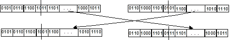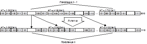 Для использования ПГА необходимо кодирование значений точек заказов в двоичную форму. Способ кодирования представлен на рис. 2. Особь представляет собой битовую строку-хромосому длиной 350 бит. Гены в этой строке имеют длину по 7 бит и представляют собой закодированные значения точек заказов. Выбор длины гена равной 7 бит обусловлен тем, что гены в РДО представляются в виде целочисленных параметров типа ресурсов Особи. Целое число в РДО представляется в виде двух байтов. Из них один бит - знаковый. Из оставшихся пятнадцати бит четырнадцать используются для представления точек заказов.