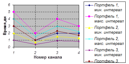 Значения этих характеристик портфелей заказов приведены на рис. 3, 4. При этом введена следующая нумерация каналов: 1 - канал крупных оптовиков, 2 - канал магазинов, 3 - канал дилеров, 4 - канал представительств фирмы.