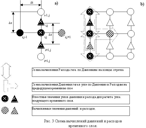 На рис.3,b) представлена схема расчета давления и расхода газа исходя из правила 1 при переходе с одного временного слоя на другой. Необходимо напомнить, что правило 1 используется только в разрезе одного временного слоя.