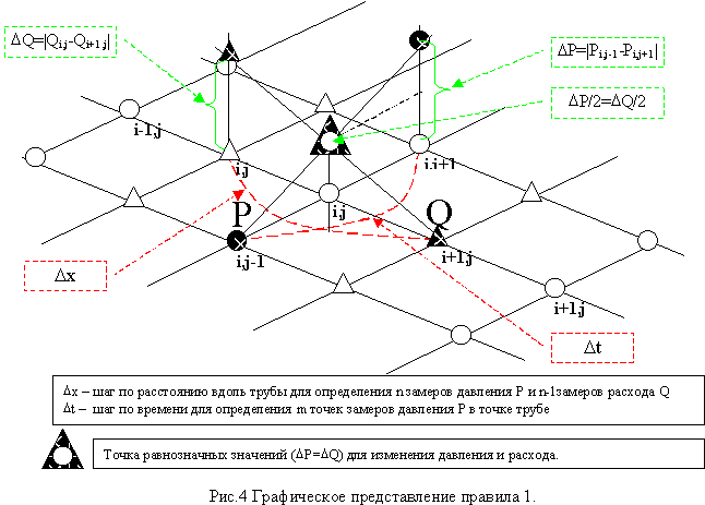 В идеале каждый временной слой представляется в виде отрезков трубы со стационарным режимом между узлами. Тогда для каждого отрезка соблюдается правило 2. На рис.3,а) представлена схема по правилам 1 и 2. В виде разностной формулы это: