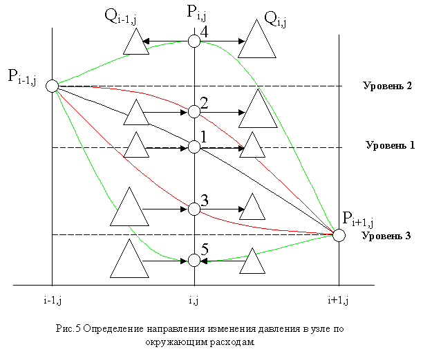 По рис.5 видно, что увеличение или уменьшение давления в узле i,j зависит от направления и значения окружающих его расходов газа. Для вариантов 4 и 5 давление в узле i,j экстремально, т.е. в четвертом случае Pi,j