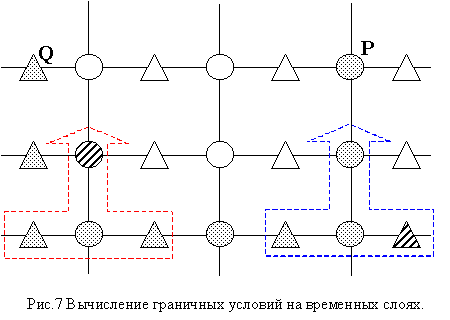 Представим, что на одном конце трубы задано P(t), а на другом Q(t). Если мы знаем на каждом временном слое Q(t) для подкачки или отбора, то давление вычисляется по обычной схеме (рис.3). Для P(t) дело обстоит несколько сложнее. На рис.7 рассмотрены оба таких примера.