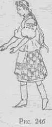 На “раз” — опуститься на правую ногу вперёд и чуть вправо, колено присогнуто. Левая нога невысоко поднимается вперед, колено свободно, подъем вытянут, но не напряжен (рис, 256).