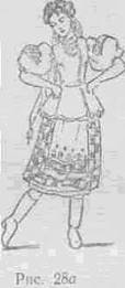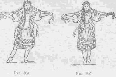 На “раз” — слегка подскочив, опуститься на всю ступню левой ноги, колено слегка присогнуто. Одновременно правая нога становится невыворотно на носок правее левой ноги, колено присогнуто и направлено влево, пятка - вправо. Корпус слегка поворачивается правым плечом вперед, голова повернута к правому плечу (рис. 28а).