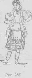 На “два” — второй подскок на всей ступне левой ноги, колено согнуто. Одновременно правая нога, вытягиваясь в колене, выворотно становится на каблук вперед и чуть вправо. Корпус слегка поворачивается левым плечом вперед, голова поворачивается к левому плечу (рис. 286).