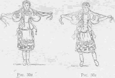 На “затакт и” — раскрыть руки широко в стороны, взяв в каждую руку по несколько лент от венка. Поднять правую ногу невысоко вправо, левая нога немного согнута в колене (рис.30а)