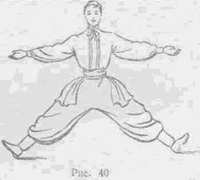 На “раз и”, “два и” — невысоко подняться с приседания, проскользнуть на каблуках в широкую вторую позицию, колени вытянуты, носки подняты вверх, руки раскрыты во вторую позицию, корпус прямой (рис. 40).