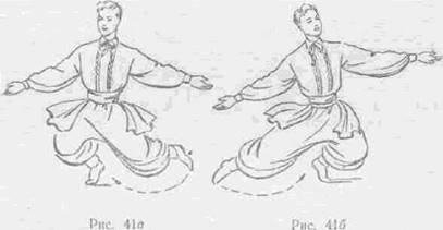 На “раз” — не поднимаясь с глубокого приседания, сделать правой ногой шаг вперед на полупальцы, тяжесть тела переходит на правую ногу (рис. 41а).