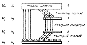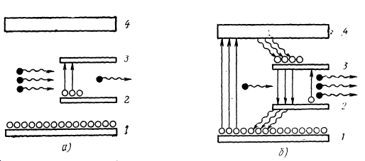 Предположим, что внутри кристалла распространяется свет с частотой, равной частоте перехода между рабочими уровнями 2 и 3, т. е. (ω=W3+W2/ћ). Он вызывает два процессора: вынужденного излучения ионов неодима, находящихся на уровне 3, и при этом к волне добавляется энергия излучения (усиление света), и процесс поглощения энергии волны ионами, находящимися на уровне 2 (рис. 2). В нормальном состоянии число ионов на уровне 2 больше, чем на уровне 3, и поглощение волны превалирует над усилением, т. е. свет ослабляется (рис.2,а). Если кристалл облучается светом накачки, то под его воздействием ионы неодима сначала переходят на уровни (полосы) накачки 4, а затем быстро на метастабильный уровень 3, где задерживаются. При достаточной мощности накачки скорость поступления ионов на метастабильный уровень превысит скорость ухода их с этого уровня за счет спонтанных переходов. В этом случае будет происходить накопление ионов на метастабильном уровне и через какое-то время число N3 превысит N2, т. е. в целом свет усилится.