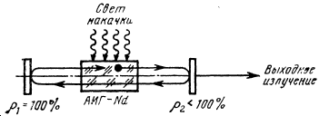 Началом генерации является спонтанное излучение ионов с метастабильного уровня, которое усиливается, проходя активную среду, и затем с помощью зеркал вновь в нее возвращается, снова усиливается и т. д. Если усиление света превосходит его суммарное ослабление за счет поглощения в среде и потерь на частичное пропускание выходного зеркала, то возникает генерация и лазер начинает излучать наружу свет. Очевидно, что мощность излучаемого света тем выше, чем выше мощность света накачки и чем меньше потери света внутри резонатора. Существует так называемая пороговая мощность накачки, при которой усиление света сравнивается с суммарными потерями, и при малейшем увеличении этой мощности может возникнуть генерация. Необходимо напомнить, что для того, чтобы усиление света всегда превосходило потери, нижний рабочий уровень 2 должен быстро опустошаться, т. е. его время жизни должно быть гораздо меньше, чем время жизни метастабильного уровня. В противном случае начнется накопление ионов неодима на уровне 2 и возрастет поглощение света с этого уровня наверх. Кроме того, время жизни ионов на уровнях накачки также должно быть малым. В противном случае ионы начнут накапливаться на уровнях накачки и инверсия населенности среды (а значит, и коэффициент усиления света) —начнет падать.
