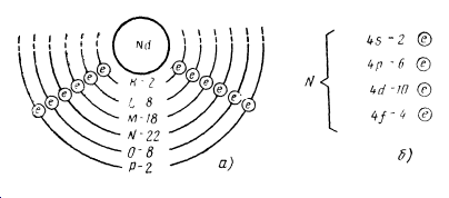 Рис 4. Структура электронных оболочек атома неодима: а — укрупненная структура оболочек; б — тонкая структура четвертой оболочки N (рядом с индексам оболочки указано количество электронов в ней)