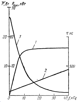 Рис. 11. Зависимости средней мощности 1),длительности импульса 2) и пиковой мощности 3) излучения второй гармоники от частоты повторения импульсов для лазера ЛТИ-701