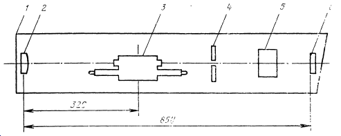 Рис. 8. Оптическая схема излучателя лазеров ЛТИ-501 и ЛТИ-502: 1 — излучатель; 2 — глухое зеркало; 3 — квантрон; 4 — селектирующая диафрагма; 5 — акустооптический затвор; 6 — выходное зеркало