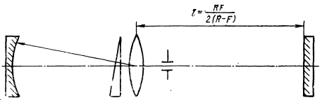Рис. 9. Оптическая схема резонатора лазера ЛТИ-504: R — радиус кривизны глухого зеркала; F —фокусное расстояние термически наведенной линзы в активном элементе