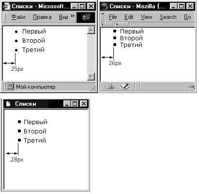 Рис. 27 Вид простого списка в браузерах Internet Explorer, Mozilla и Opera