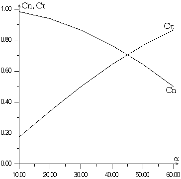 Рис. 7. Зависимость коэффициентов силы лобового сопротивления и подъемной силы от угла атаки.
