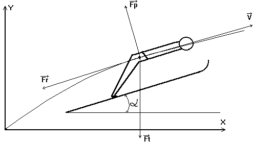 Ось абсцисс направлена в сторону полета лыжников параллельно горизонту, ось ординат - вверх через край стола отрыва, называемый кантом отрыва. Начало координат расположено так, что абсцисса точки старта и ордината критической точки - конца участка приземления - равны нулю. Если нет бокового ветра и других возмущений, центр масс лыжника описывает кривую в вертикальной плоскости, то есть задачу полета можно рассматривать как двухмерную.