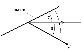 ( - угол между лыжами и горизонталью, - угол между скоростью и горизонталью, - угол атаки).