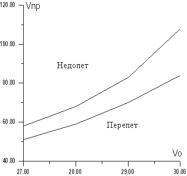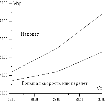 Рис.13. Допустимая зона изменения предельной и начальной скоростей при фиксированном угле наклона лыж к горизонту