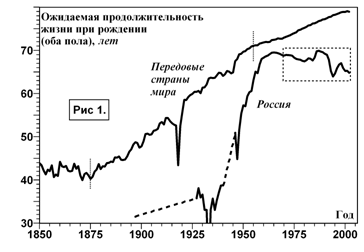 В послевоенные годы ситуация стала быстро выправляться, так что к середине 60-х отставание сократилось всего до нескольких лет. После этого, однако, продолжительность жизни россиян начинала медленно сокращаться на фоне неуклонно увеличения этого показателя во всем мире. На рис. 1 показана динамика продолжительности жизни для России и десятка передовых стран.