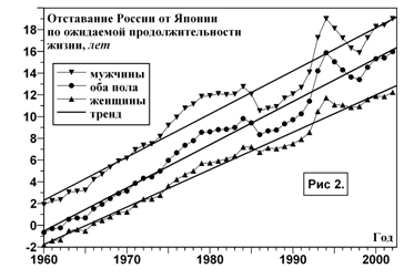 Можно было предположить, что остановка модернизации смертности в нашей стране было результатом ее догоняющего развития в XX веке. Однако, как показывает опыт Японии, это не так. В экономическом плане Япония, как и Россия, шла путем догоняющего развития и ускоренной индустриализации. Вплоть до 60-х годов ситуация c модернизацией смертности в обеих странах также была весьма сходной: большое отставание от стран Запада перед Второй мировой войной и быстрое преодоление отставания – после. Однако в дальнейшем Япония постепенно становится мировым лидером по продолжительности жизни, тогда как Россия – главным аутсайдером среди промышленно развитых стран. Даже среди европейских республик СССР она была на последнем месте по продолжительности жизни мужчин и на предпоследнем – женщин. Разрыв в продолжительности жизни японцев и россиян увеличивается на год каждые 2,5÷3 года уже свыше сорока лет (см. рис. 2).