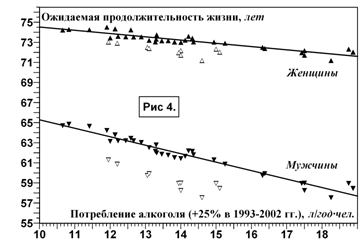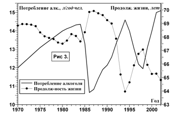 На рис. 3 приведены графики потребления алкоголя (по данным А.В. Немцова) и ожидаемой продолжительности жизни в России. Как легко видеть, эти показатели колеблются точно в противофазе: падение продолжительности жизни совпадает с увеличением потребления алкоголя.