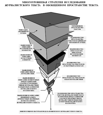 В соответствии с культурологическими составляющими устанавливаются и описываются социокультурные типы журналистики, конкретизируются особенности издания и индивидуальнозначимые качества языковой личности автора текста, что, в конечном итоге, приводит к построению лингвосоциокультурной модели конкретного журналистского текста.